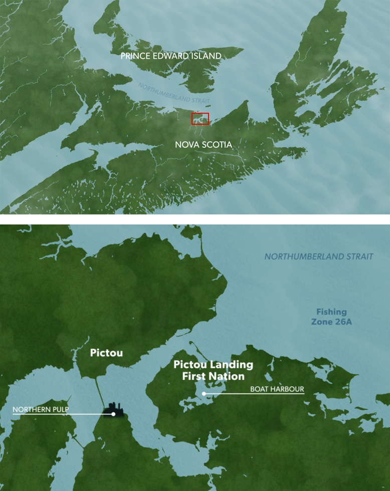 Pictou County is in Nova Scotia, located on the coast of the Northumberland Strait. The primary communities affected by Northern Pulp (‘the mill’) are the Town of Pictou and Pictou Landing First Nations (the site of Boat Harbour, where the current effluent treatment facility resides).